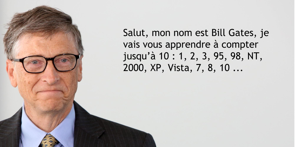 Salut, mon nom est Bill Gates, je vais vous apprendre à compter jusqu’à 10 : 1, 2, 3, 95, 98, NT, 2000, XP, Vista, 7, 8, 10 ...